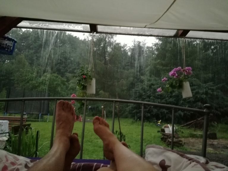 Už 2 roky spíme venku za každého počasí. Rosa na nás nepadá a déšť nás nezažene. Zato pozorujeme s úžasem měnící se barvy v zahradě, když svítá a posloucháme štěbetající ptactvo, Drozdy, ráno co ráno zápasící s žížalami v ranní rose.