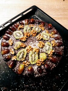 Pečte cca 45-50 minut na 170C . Po upečení je to na Vás, ale já přelila 85% rozpuštěnou čokoládou, doplnila maliny, mandle a trochu podrcených oříšků. Nechala ztuhnout v lednici. Je opravdu výtečný a jako bonus super zdravý!