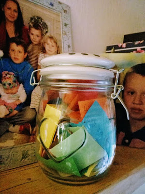 Je to jednoduché! Stačí větší sklenice, štůsek barevných papírků (vypadají ve sklenici veseleji) a propiska, která je u sklenice stále k dispozici. Celý rok pak nezávisle jeden na druhém, (klidně zapojte i děti) píšeme na papírky malé vzkazy lásky. To co se povedlo, čeho jsme si všimli hezkého na tom druhém, co nám udělalo radost, co jsme překonali, nebo za co jsme vděční. A pak za zvuku ohňostrojů – které nemáme rádi, protože všechna zvířata v naší rodině chtějí k nám do postele – když se otevře další rok zázraků, vysypete sklenici na stůl. A věřte mi, jsou to nejhezčí a nejdojemnější chvíle roku, když čtete do té doby tajné papírky lásky. V tu chvíli 100% víte, že jste na správném místě se správným člověkem!